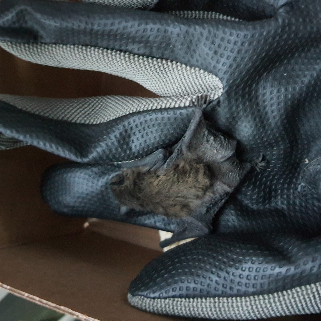 Die kleine Fledermaus hing an einer Hauswand im Garten, keine 10cm über dem Boden und war schon seit über einem Tag an dem Eck auf dem Boden herumgekrabbelt. Die Vermutung lag also nahe, dass es sich um ein Jungtier handelte, das irgendwie seine Mutter verloren hatte. Immerhin konnte ich direkt sagen, dass es vermutlich eine Zwergfledermaus war und musste mir daher immerhin weniger Sorgen um Bisse machen (die haben so kleine Zähne, dass sie fast nicht durch die Haut kommen). Dennoch zog ich meine Handschuhe über und streifte die Kleine in meine Tragebox, die ich mit einem alten Waschlappen zum Verstecken ausgestattet hatte. Das Tier wollte meinen Handschuh gar nicht mehr loslassen, sodass ich ihn einfach auszog und der Flausi damit etwas mehr Ruhe zum Runterkrabbeln gab.